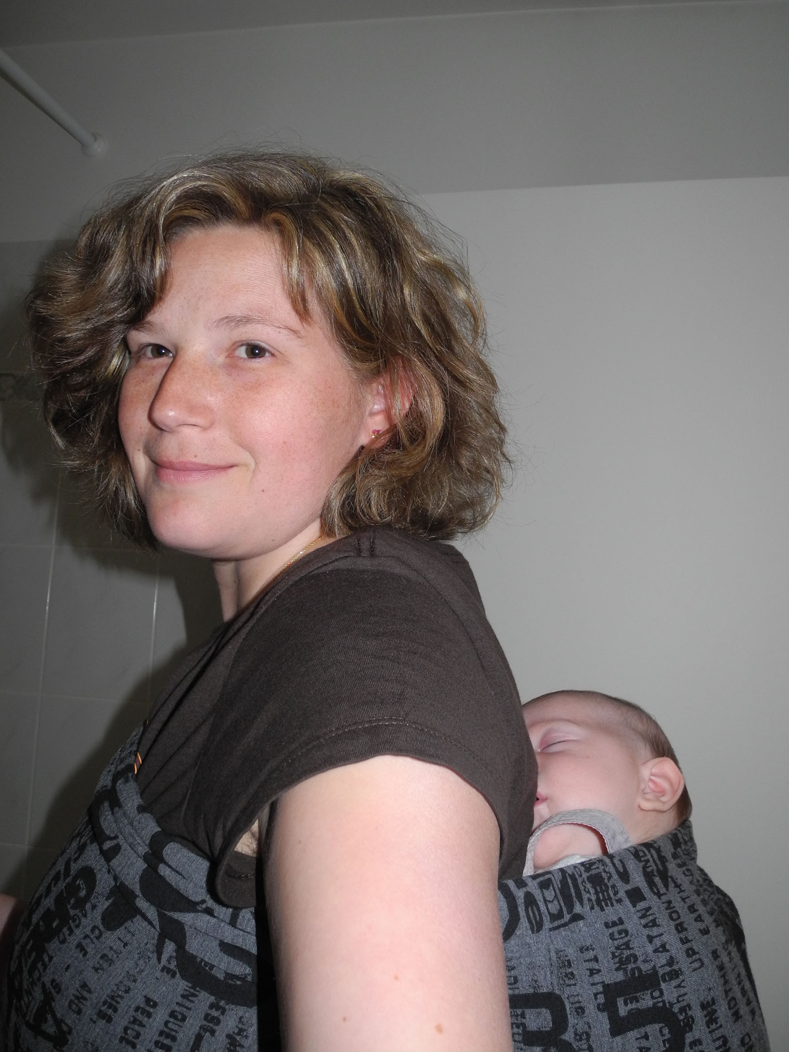 Papa et Maman me portent de temps en temps dans le tube pour aller faire une petite course rapide. Mais maman trouve ça aussi bien pratique pour passer l’aspirateur, mais contrairement à d’habitude, elle me met dans le dos ! ^^