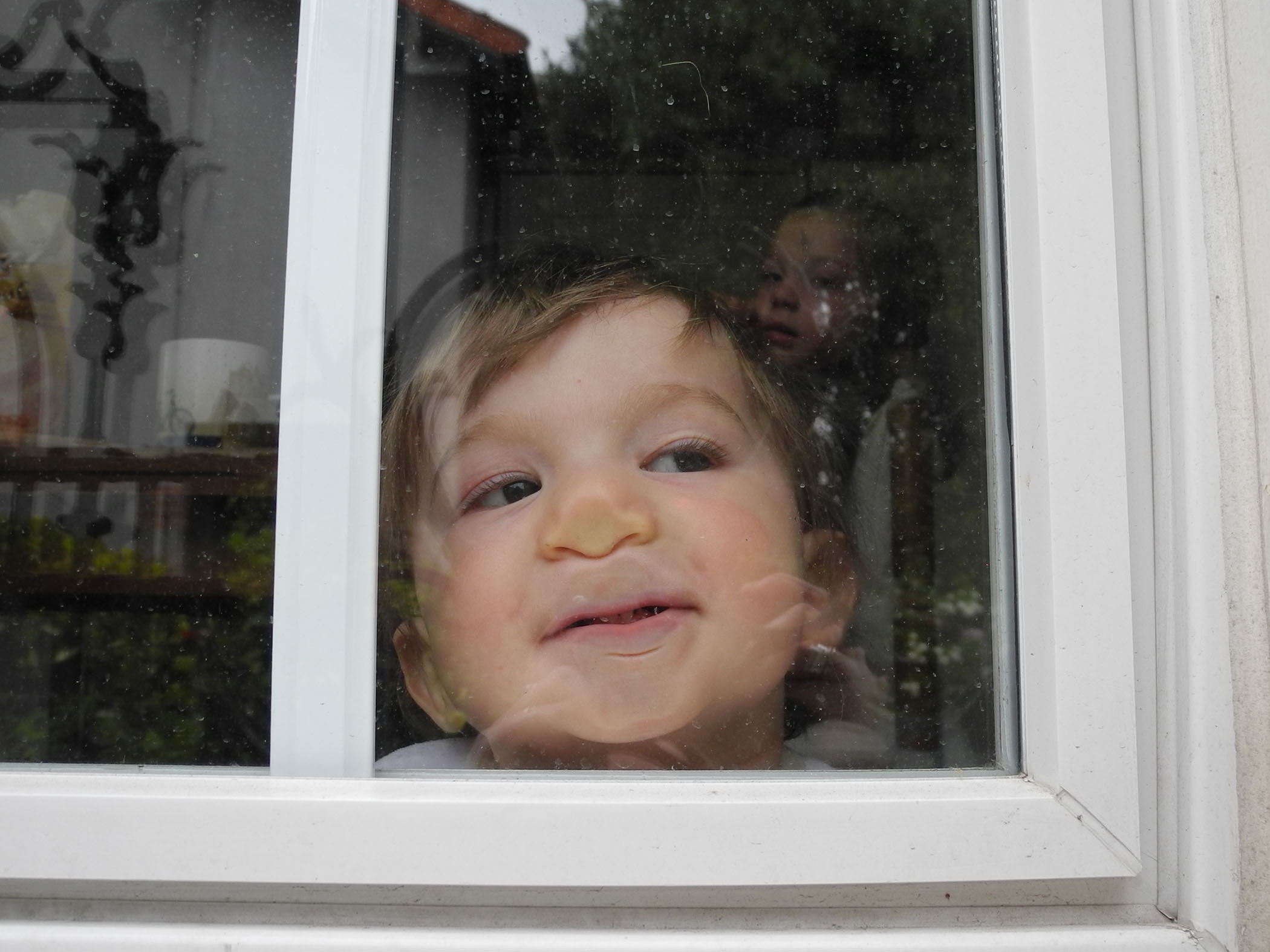L’autre jour, maman est sortie dans le jardin et je me suis amusée avec elle à faire des grimaces et à coller mon nez, ma bouche, mes mains (…) contre la fenêtre. C’est drôlement rigolo, même maman a craqué et pris des photos ! 🙂