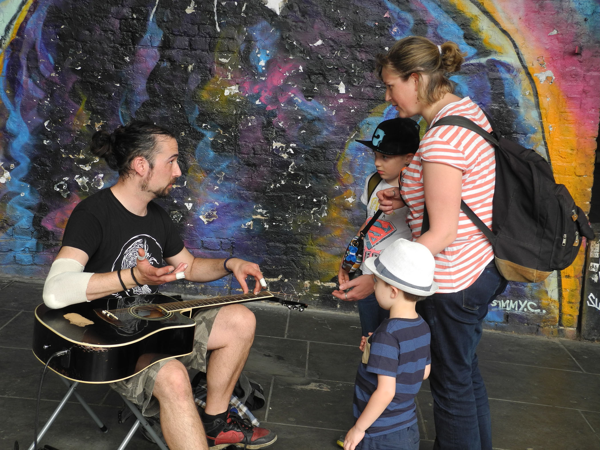 A Londres, on voit des trucs trop cool dans les rues ! On a croisé ce monsieur qui jouait… avec sa guitare sur les genoux ! 😮