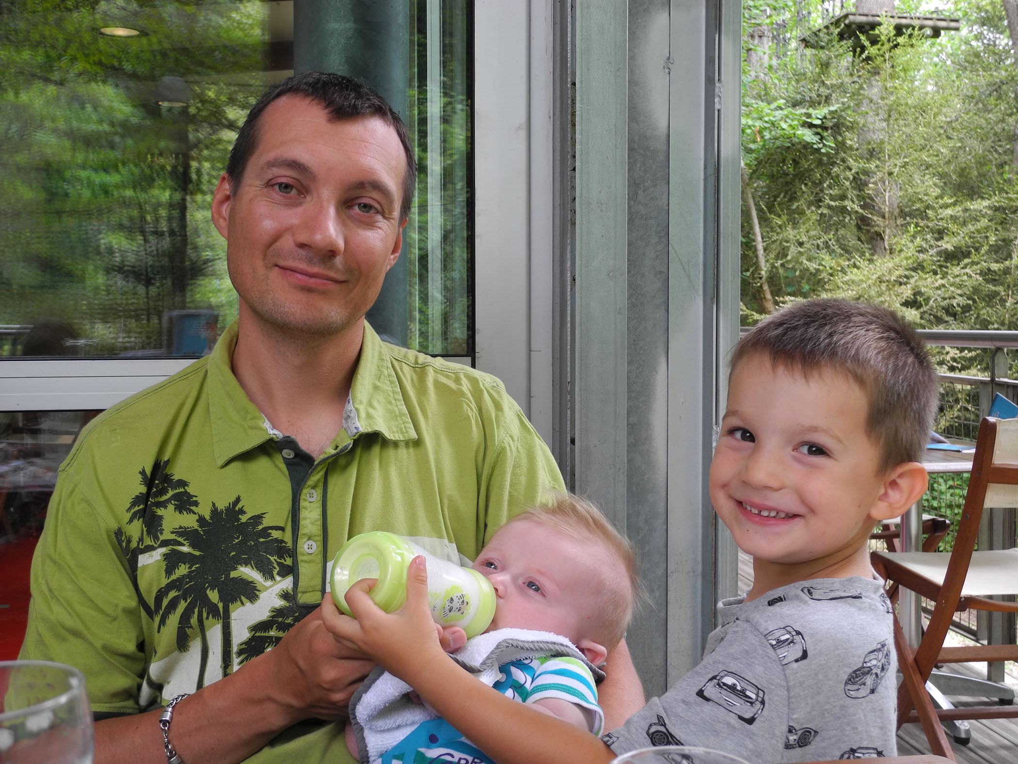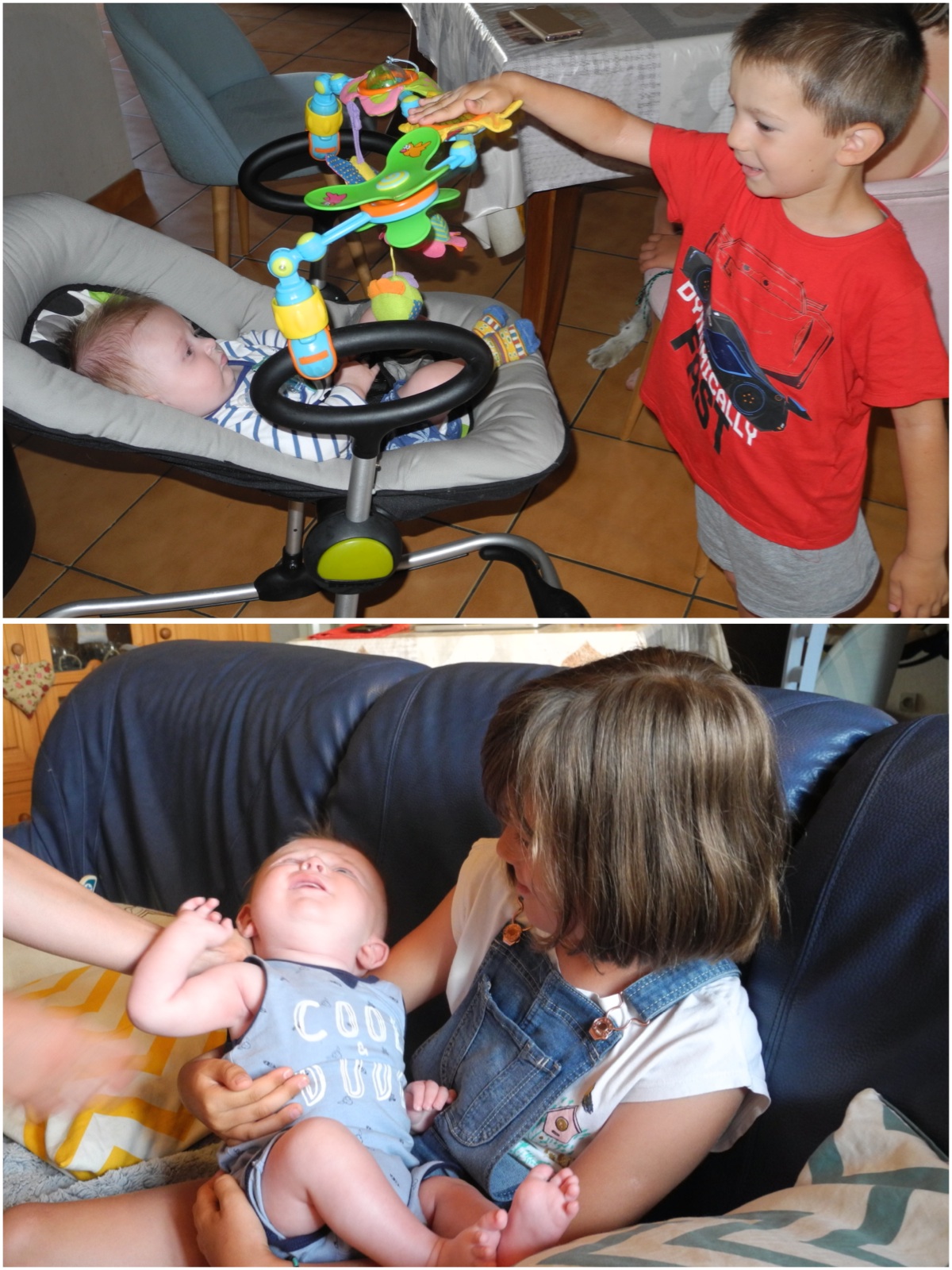 Comme je suis trop petit pour prendre Clément dans mes bras, j’aide Papa quand il lui donne le biberon. Voilà, Papa comme ça, pas trop haut, pas trop bas non plus…
